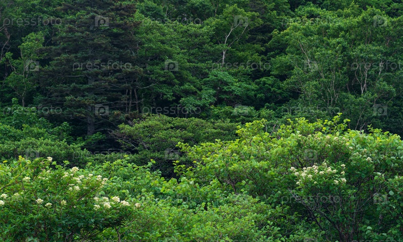 Прибрежный лес карликовых деревьев на склоне вулкана на острове Кунашир в пасмурную погоду