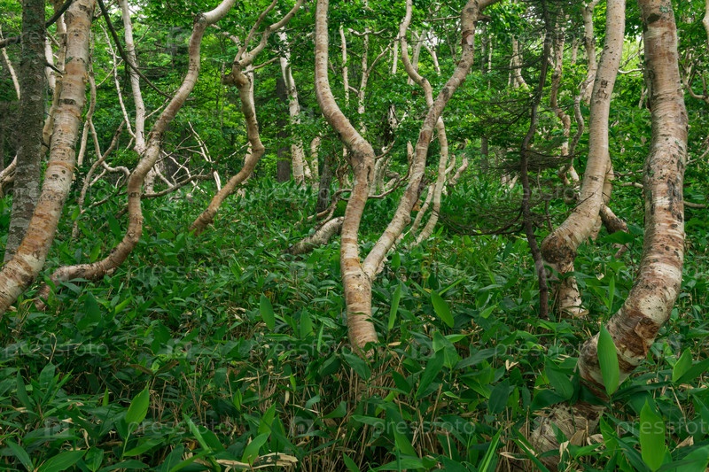 Лесной пейзаж острова Кунашир, искривленные деревья и подлесок карликового бамбука