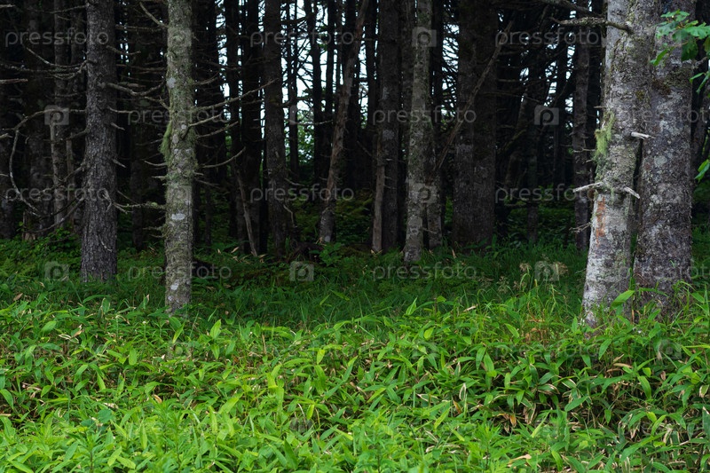 Прибрежный лес с буреломом и зарослями карликового бамбука на тихоокеанском побережье, Курильские острова