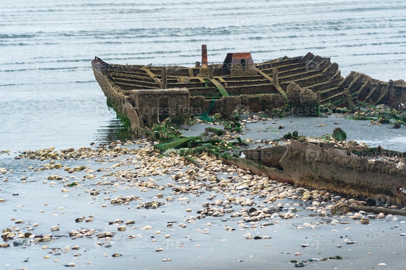 Остатки разбитого корабля на туманном берегу моря