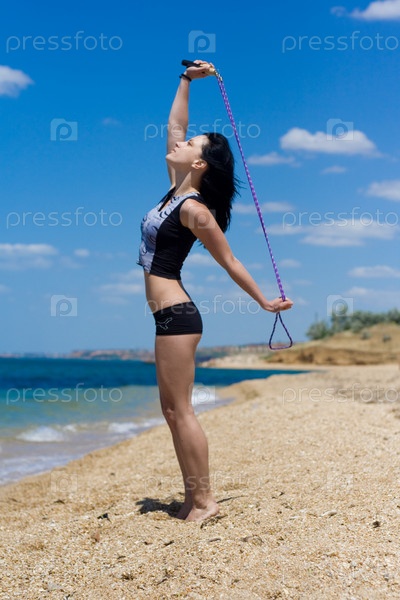 Девушка на пляже занимается фитнесом