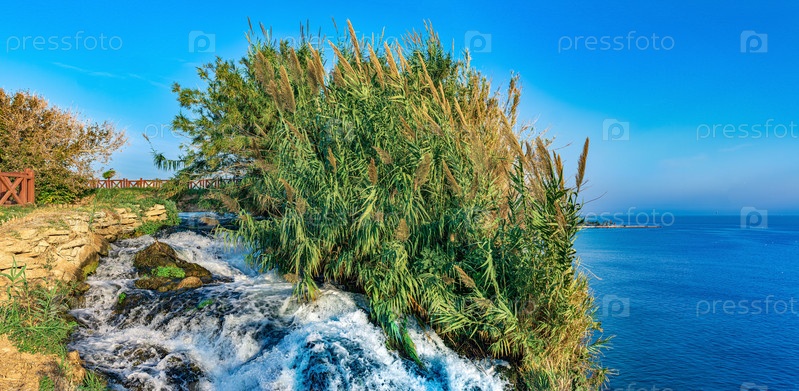 Природный ландшафт с тростником, растущим на краю водопада на скале над морем, Нижний Дюден, Анталья