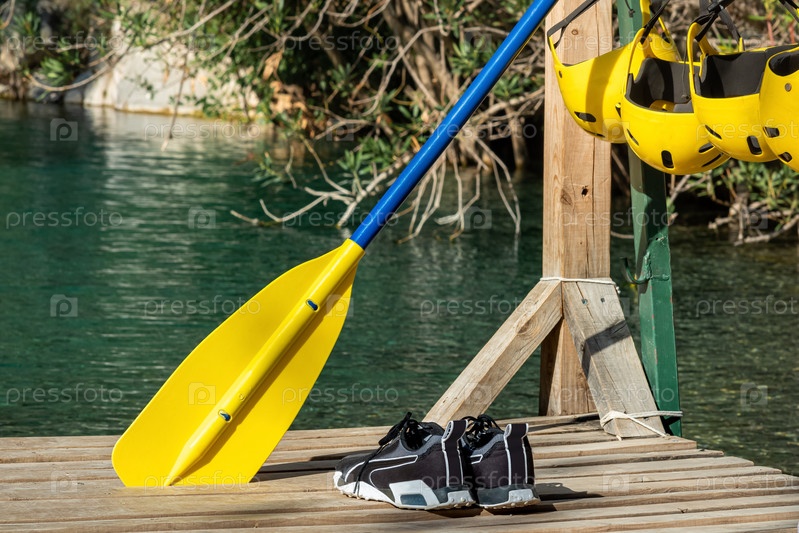 Причал для сплава со сложенным снаряжением – каски, весла. Каньон Гейнюк, Анталья