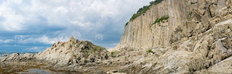 Панорама с прибрежным утесом, образованным застывшими лавовыми каменными колоннами, мыс Столбчатый на острове Кунашир