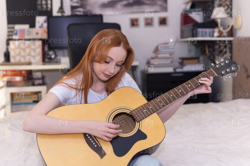 Молодая женщина играет дома на акустической гитаре