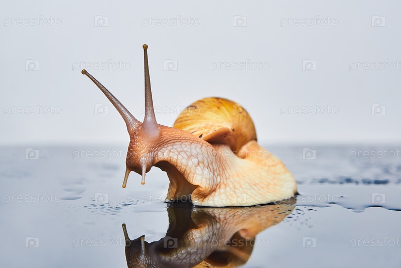 Живая улитка смотрит на свое отражение на гладкой черной поверхности на светлом фоне