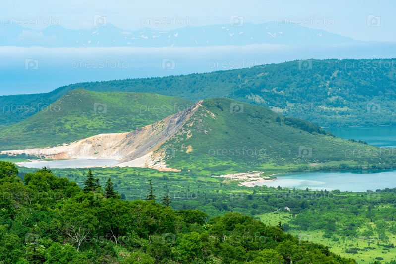 Пейзаж острова Кунашир, геотермальные озера среди лавовых куполов в центре кальдеры вулкана Головнина; остров Хоккайдо виден вдалеке в море