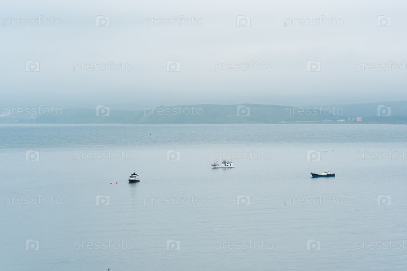 Рыбацкие лодки в море на фоне далекого туманного побережья