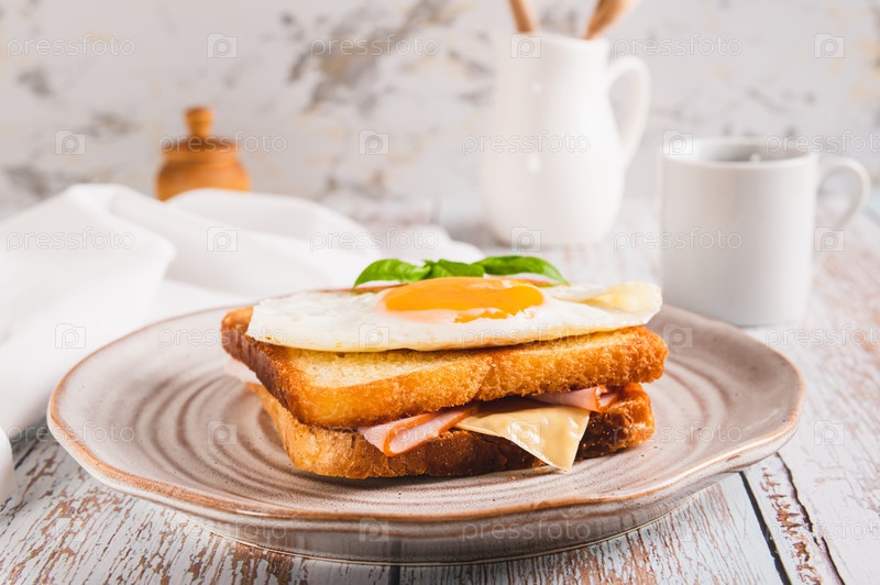 Сэндвич с крок-мадам с ветчиной, сыром и яйцом на тарелке на столе