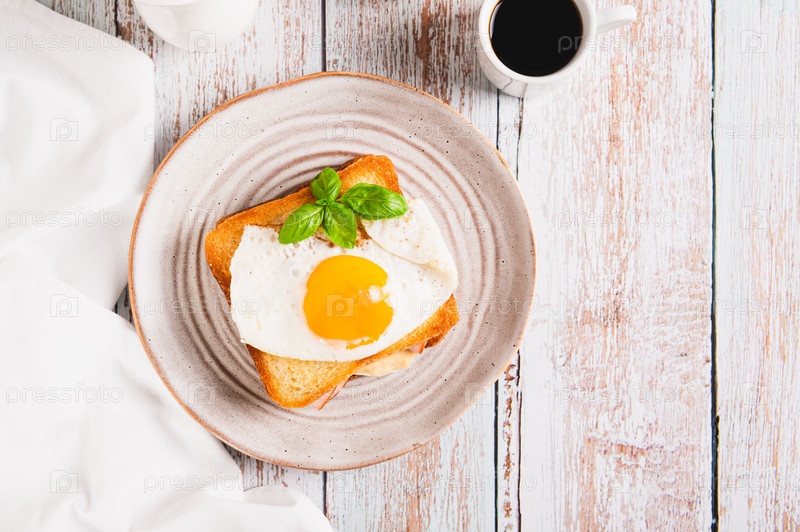 Сэндвич с крок-мадам с ветчиной, сыром и яйцом на тарелке на столе, вид