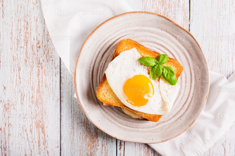 Крупный план сэндвича с крок-мадам с ветчиной, сыром и яйцом на тарелке на столе