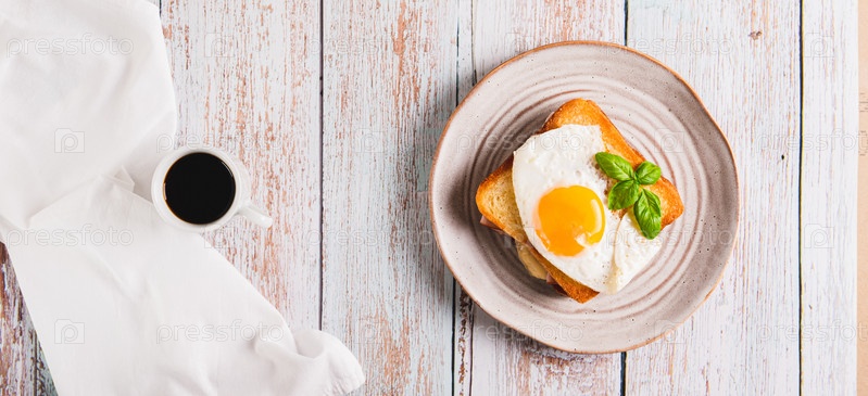 Французский крок-мадам, горячий сэндвич с завтраком на тарелке на столе, вид на веб-баннер