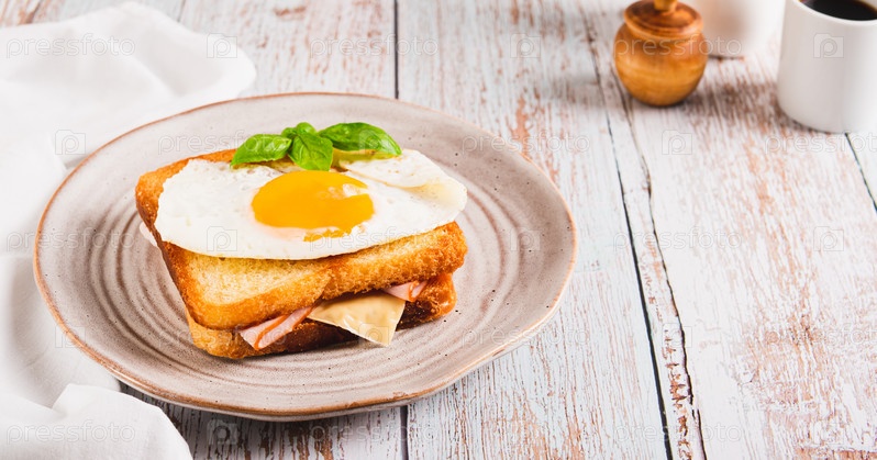 Крок мадам сэндвич с ветчиной, сыром и яйцом на тарелке на столе веб-баннер