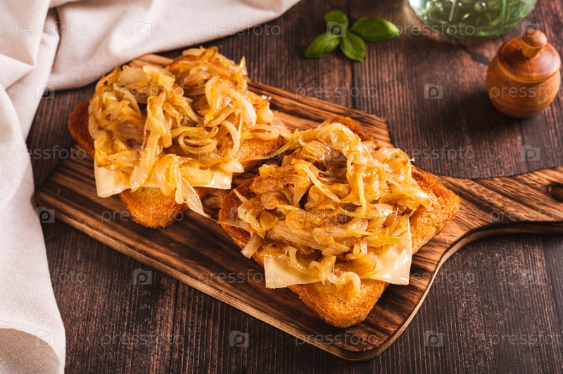 Домашняя брускетта с сыром и жареным луком на деревянной доске