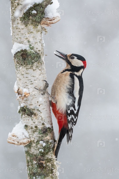 Большой пестрый дятел самец на березе