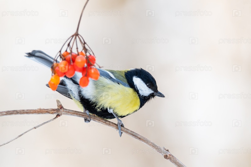 Большая синица и ягоды калины