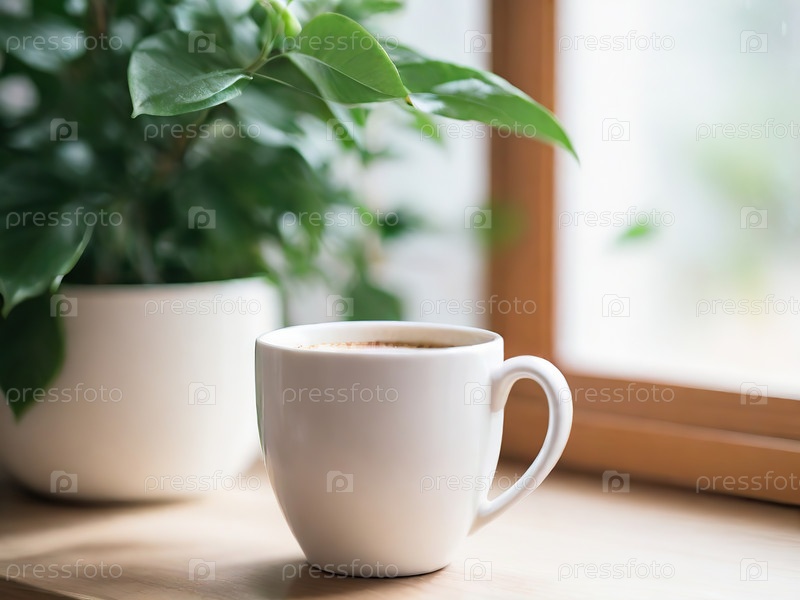 Комната со спокойной атмосферой, с глиняными горшками, стоящими перед стеной, и шторами, пропускающими естественный свет. кофе и различные предметы на столе