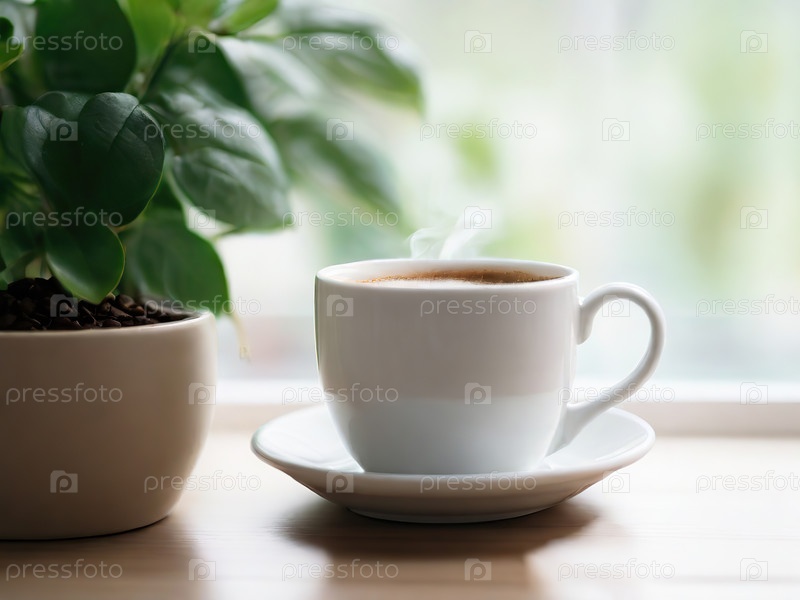 Комната со спокойной атмосферой, с глиняными горшками, стоящими перед стеной, и шторами, пропускающими естественный свет. кофе и различные предметы на столе