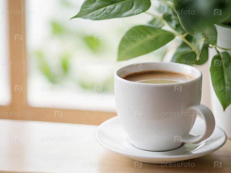Комната со спокойной атмосферой, с глиняными горшками, стоящими перед стеной, и шторами, пропускающими естественный свет. кофе и различные предметы на столе