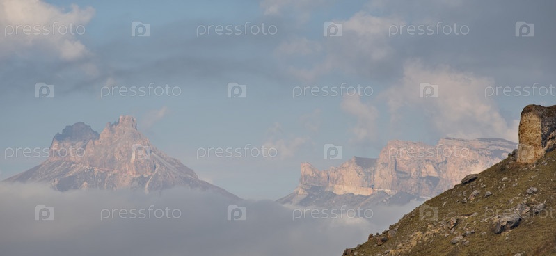 Россия. Приэльбрусье. Высокие горные вершины Северного Кавказа окружены утренними туманными облаками, парящими на разных уровнях неприступных скал