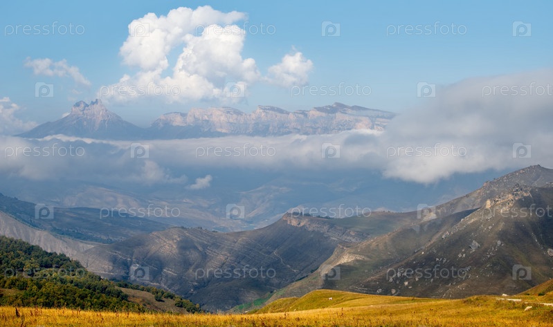 Россия. Приэльбрусье. Высокие горные вершины Северного Кавказа окружены утренними туманными облаками, парящими на разных уровнях неприступных скал