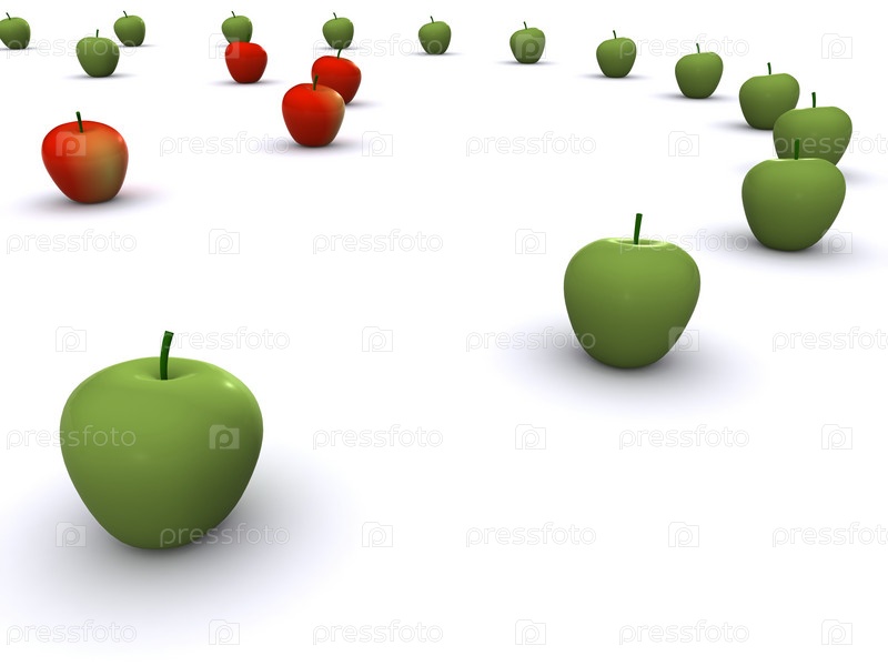 Множество красных и зеленых яблок крупным планом на белом фоне