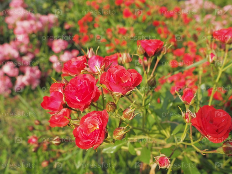 Крупный план куста красных роз в летнем саду под солнечным светом. Красные кустовые розы с множеством бутонов и распустившимися цветками. Клумба в парке, способ украшения улиц и пейзажей