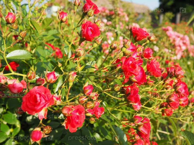 Крупный план куста красных роз в летнем саду под солнечным светом. Красные кустовые розы с множеством бутонов и распустившимися цветками. Клумба в парке – способ украшения улиц и пейзажей