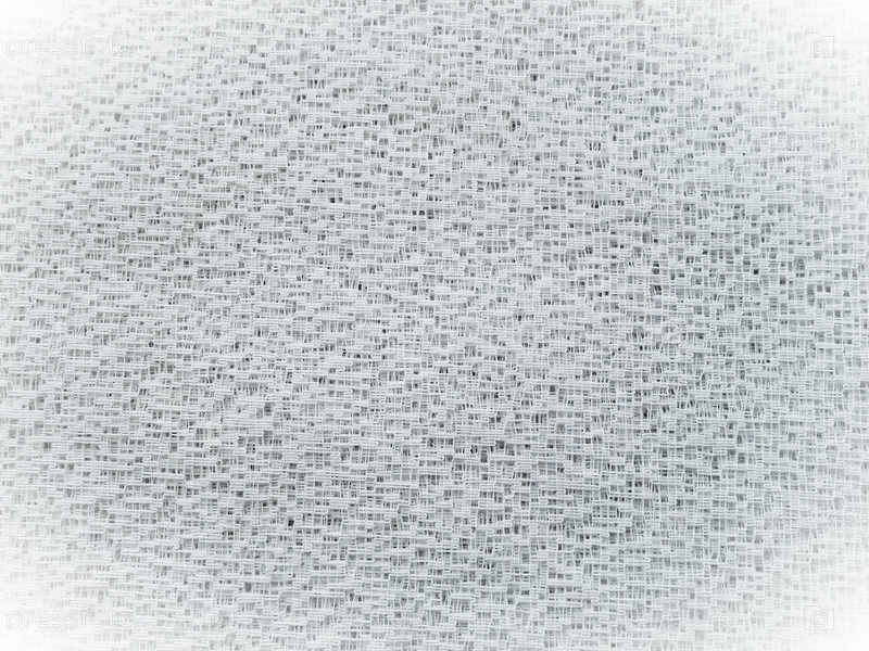 Прозрачный белый тюль в виде сетки. Сетчатая ткань помята или небрежно сложена. Крупный план. Белая вуаль или муслин. Занавес с отверстиями разного размера крупным планом. Белое виньетирование по краям
