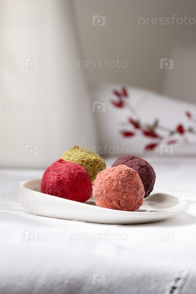 Конфета трюфель разноцветный в белой тарелке на столе