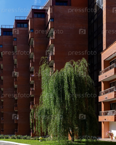 17.09.2023, Россия, Московская область, городской округ Ступино, деревня Петрово, территория Пансионата «Заря». Многоэтажное здание жилого корпуса пансионата. На лужайке здания растет лиственное дерево