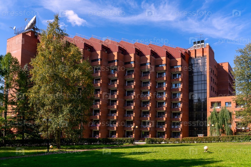 Многоэтажное здание из красного кирпича было сфотографировано на фоне голубого неба