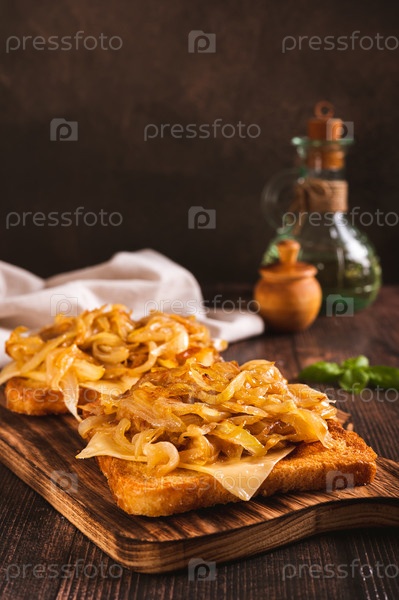 Аппетитный тост с плавленым сыром и карамелизированным луком на доске, вертикальный вид