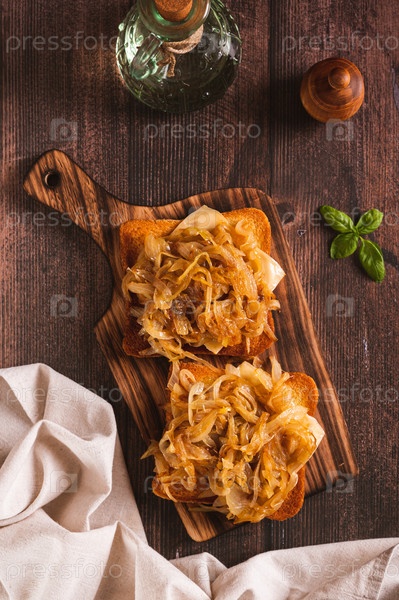 Домашняя брускетта с сыром и жареным луком на деревянной доске и вертикальный вид