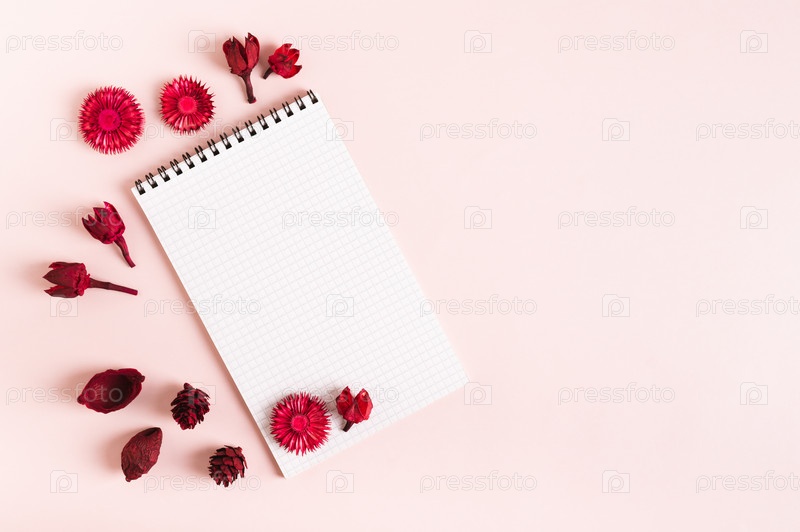 Пустой блокнот для письма и сухие красные цветы на розовом фоне, вид сверху