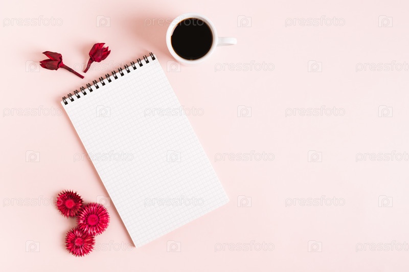 Блокнот для письма, чашка кофе и сухие красные цветы на розовом фоне, вид сверху