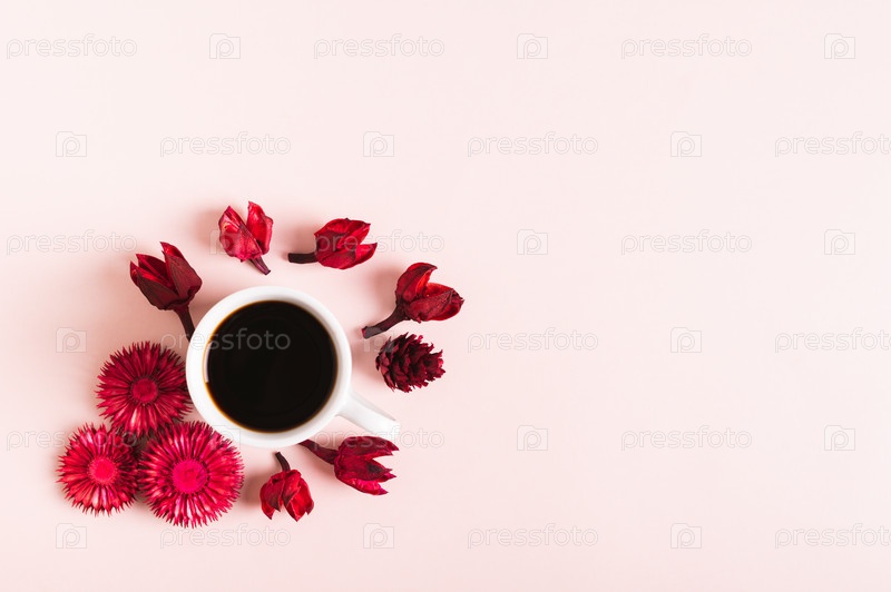Сухие красные цветы вокруг чашки с черным кофе на розовом фоне, вид сверху