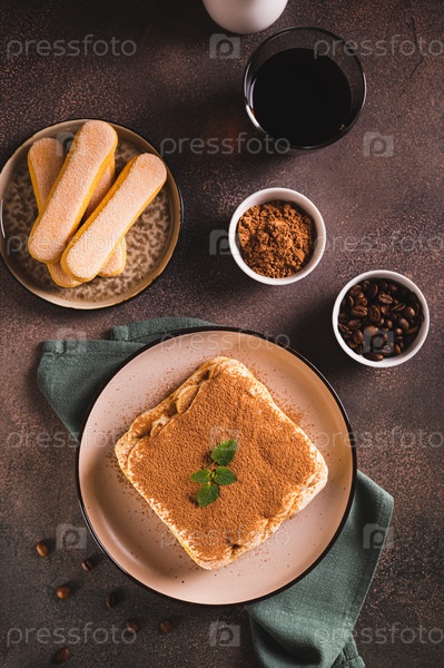 Торт Тирамису из печенья, нежных сливок и кофе на тарелке и вертикальном виде