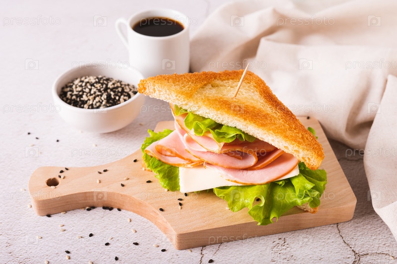 Тост-сэндвич с ветчиной, сыром и зеленью на деревянной доске на столе