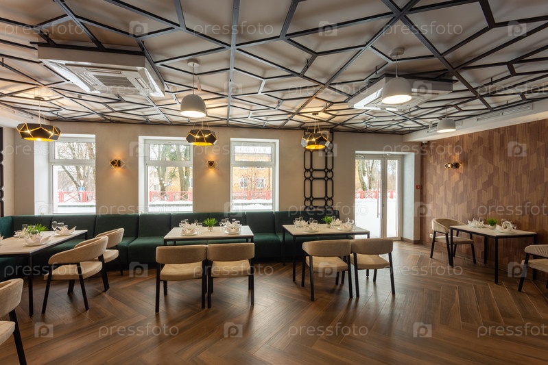 Современный интерьер городского ресторана или кафе с обеденными зонами
