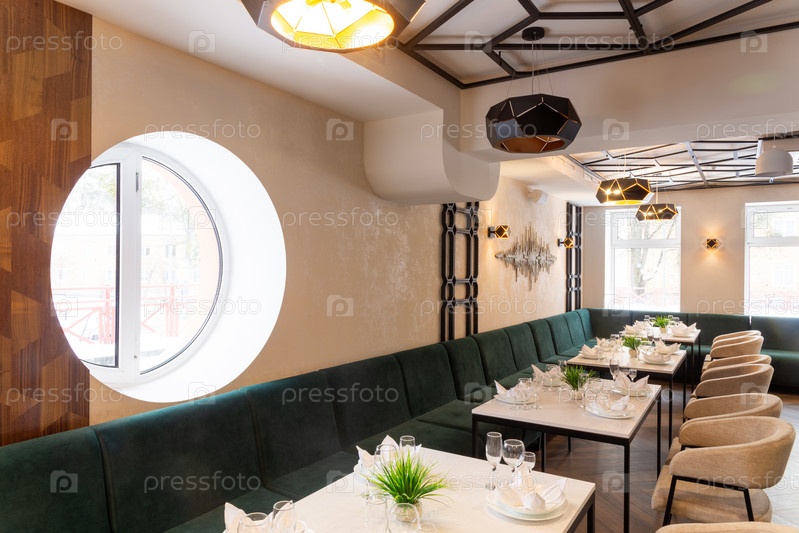 Современный интерьер городского ресторана или кафе с обеденными зонами
