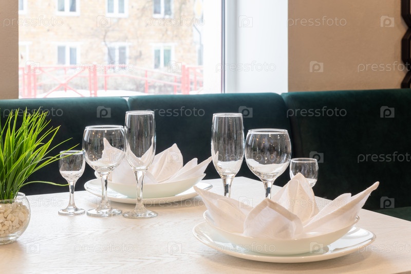 Стаканы, тарелки, салфетки подаются на ужин в ресторане с уютным интерьером. Стаканы и тарелки на столе в ресторане подаются на ужин
