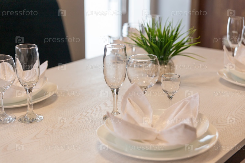 Стаканы, тарелки, салфетки подаются на ужин в ресторане с уютным интерьером. Стаканы и тарелки на столе в ресторане подаются на ужин