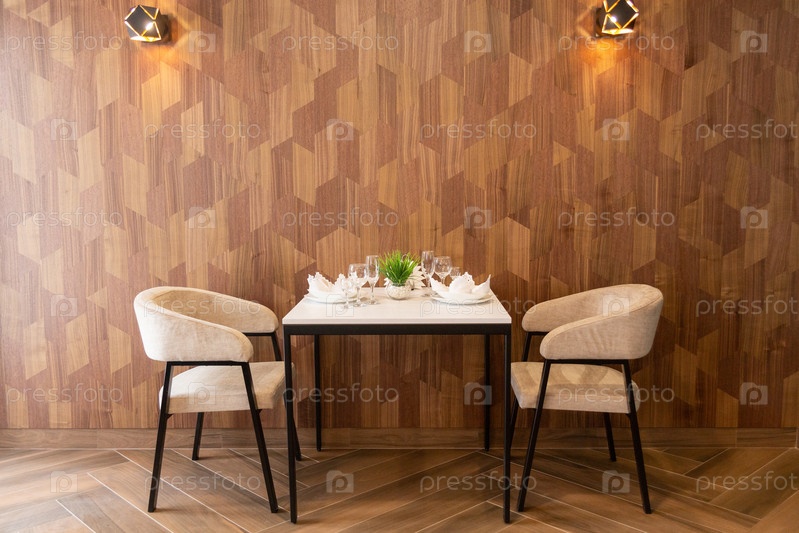 Накрытие стола на двоих в кафе, столовой, ресторане. Стол и два стула стоят у стены. Пустые места для посетителей. Место для свидания, романтической встречи