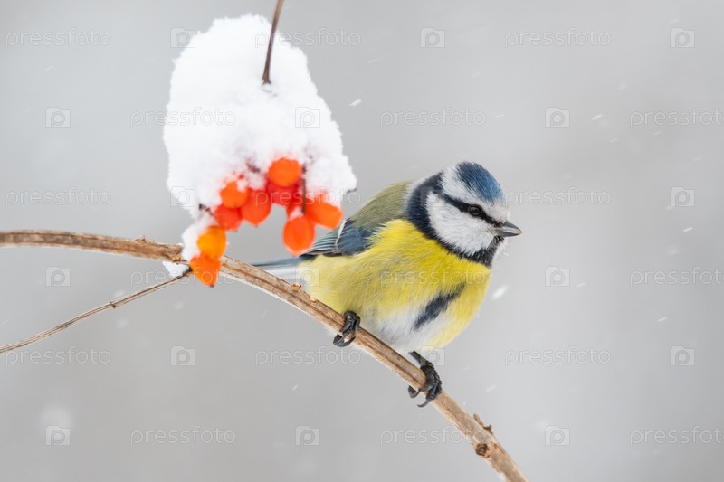 Синица лазоревка и ягоды калины