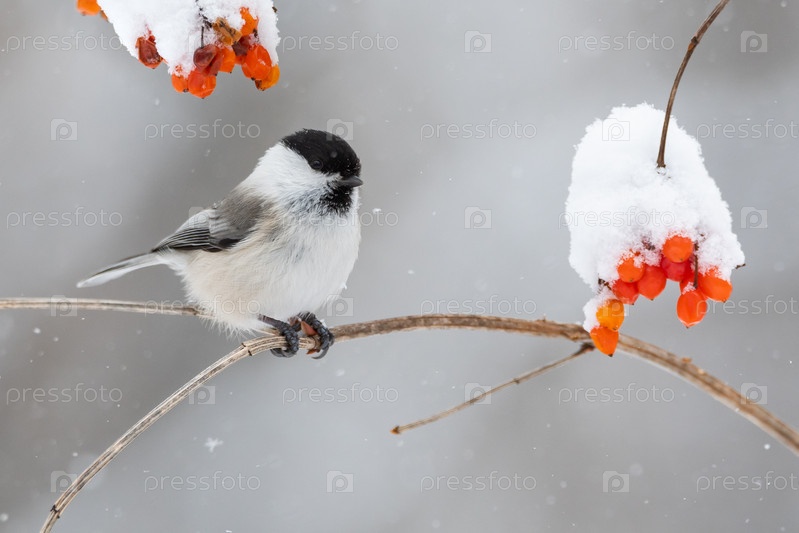 Буроголовая гаичка или пухляк и ягоды калины
