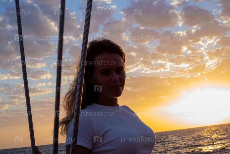 Девушка на парусной яхте во время заката в Сочи