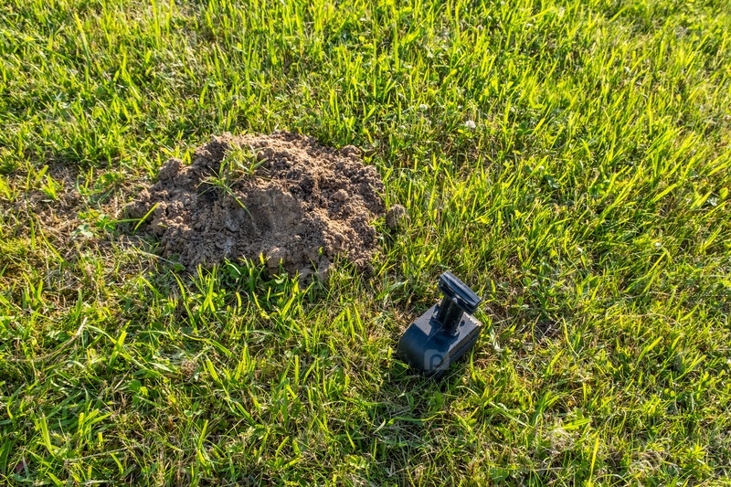 Ловушка для кротов, установленная на лужайке, изображение крупным планом