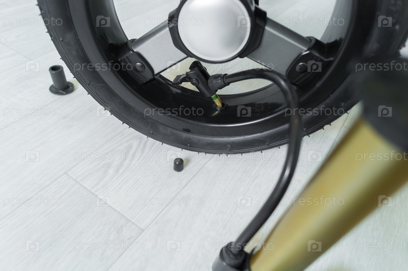 Накачивание спущенной шины новой детской коляски. Сборка и накачка колеса коляски для новорожденного ручным насосом. Селективный фокус