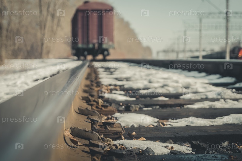 Крупный план старых железнодорожных гвоздей для крепления рельсов к деревянным шпалам. Размытый грузовой вагон стоит на запасном пути железной дороги. Селективный фокус